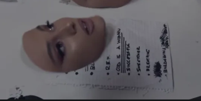 A track list can be seen in the video, with 11 bullet points.[29] A scrapped song, "You", is crossed off between "Breathin" and "Borderline". "Breathin" was later released without the g that was included in the title of the video. "God Is A Woman" is underlined multiple times, which later became the second single from Sweetener.