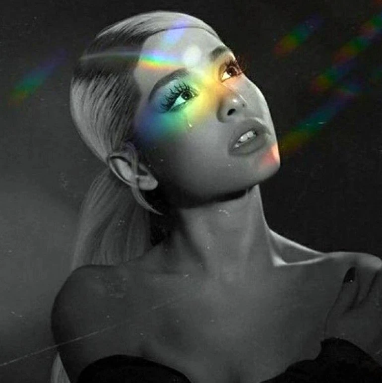 The cover was revealed on April 18, 2018.[14][15] For it, Grande looks to the right as a rainbow rests across her eyes. Rainbows are a natural phenomenon that appear after rain, as the sun refracts through the water droplets. Symbolically, a rainbow tends to represent the idea of hope and optimism. The image illustrates the idea that Ariana's teardrops have faded, resulting in the rainbow, and she is ready to move on.